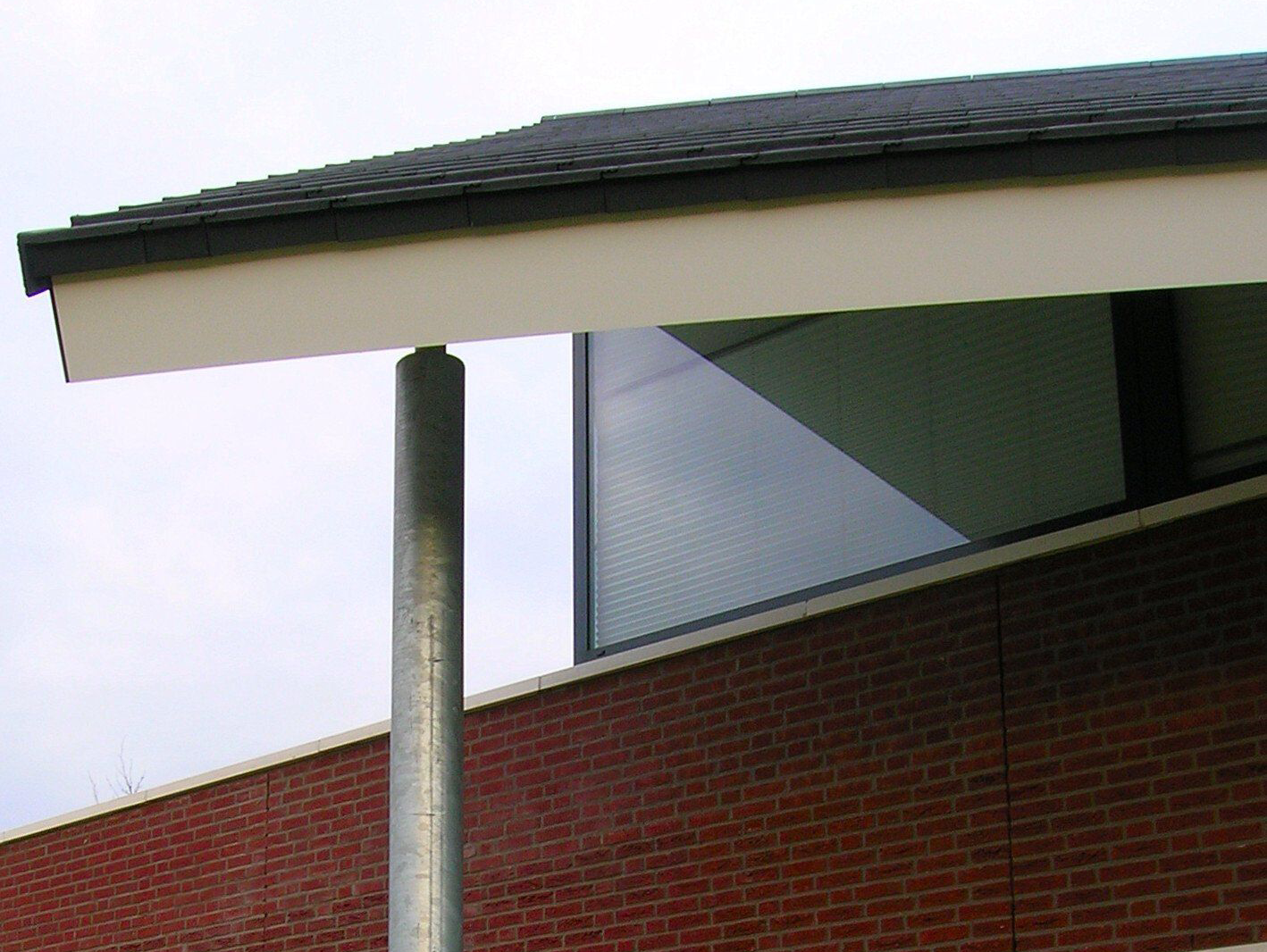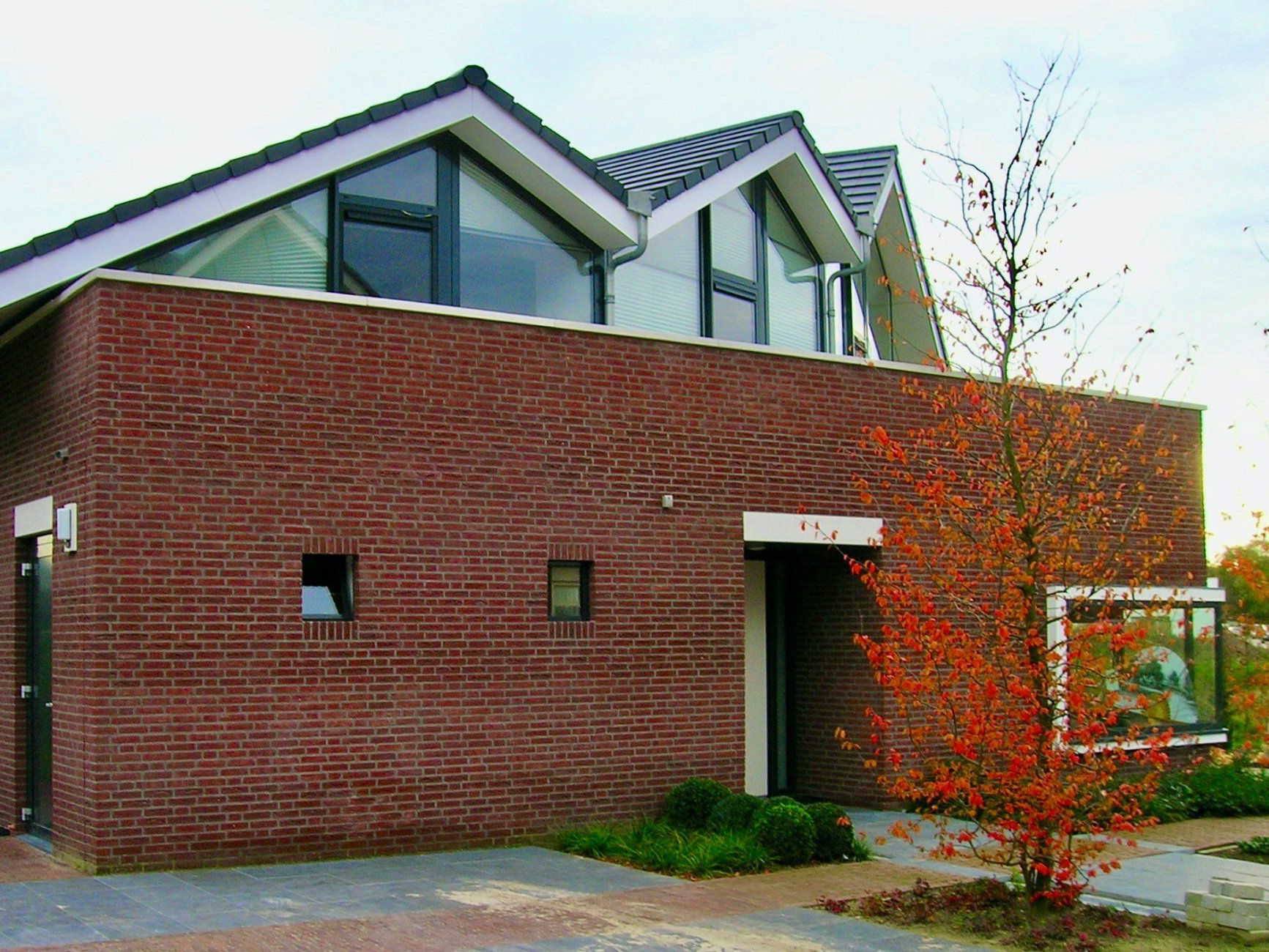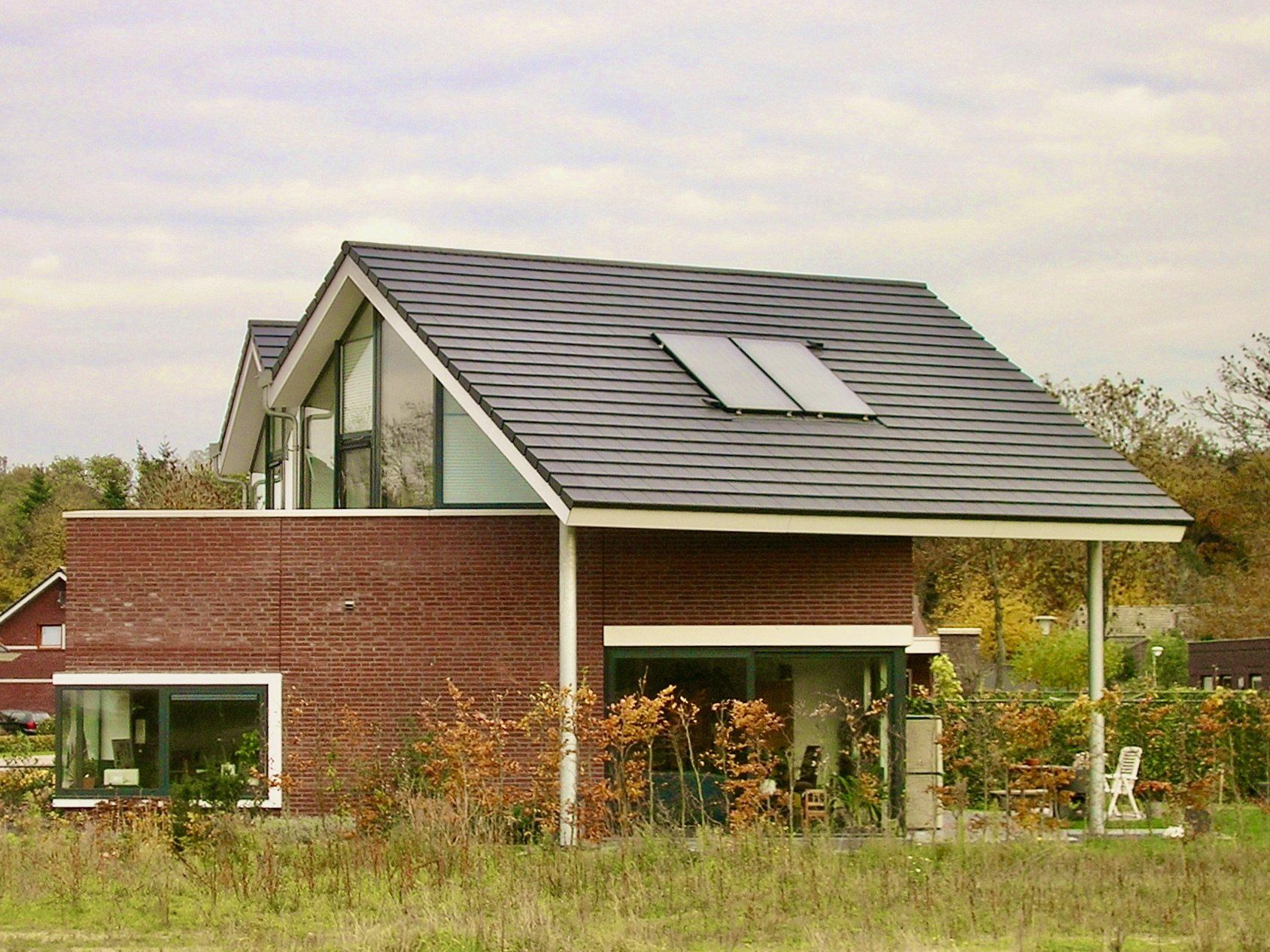 De woning ligt aan een laantje dat uitmondt in een open ruimte die als wadi dient. De overgang naar de open ruimte wordt benadrukt door het over de stenen onderbouw uitwaaierende dak. De karakteristieke vorm van het dak zorgt voor een overdekt terras op de begane grond en een zonneterras op de verdieping. De aanzet van de driedeling van het dak is hierbij subtiel gedetailleerd in de achtergevel. De witte muurdorpels en lateien versterken de gewenste horizontale architectuur. Bij de dakoverstekken wordt het regenwater opgevangen in grindkoffers in het terrein en afgevoerd naar de wadi. Het overige regenwater stroomt aan weerskanten bij de hoofdentree door molsgoten naar de wadi.