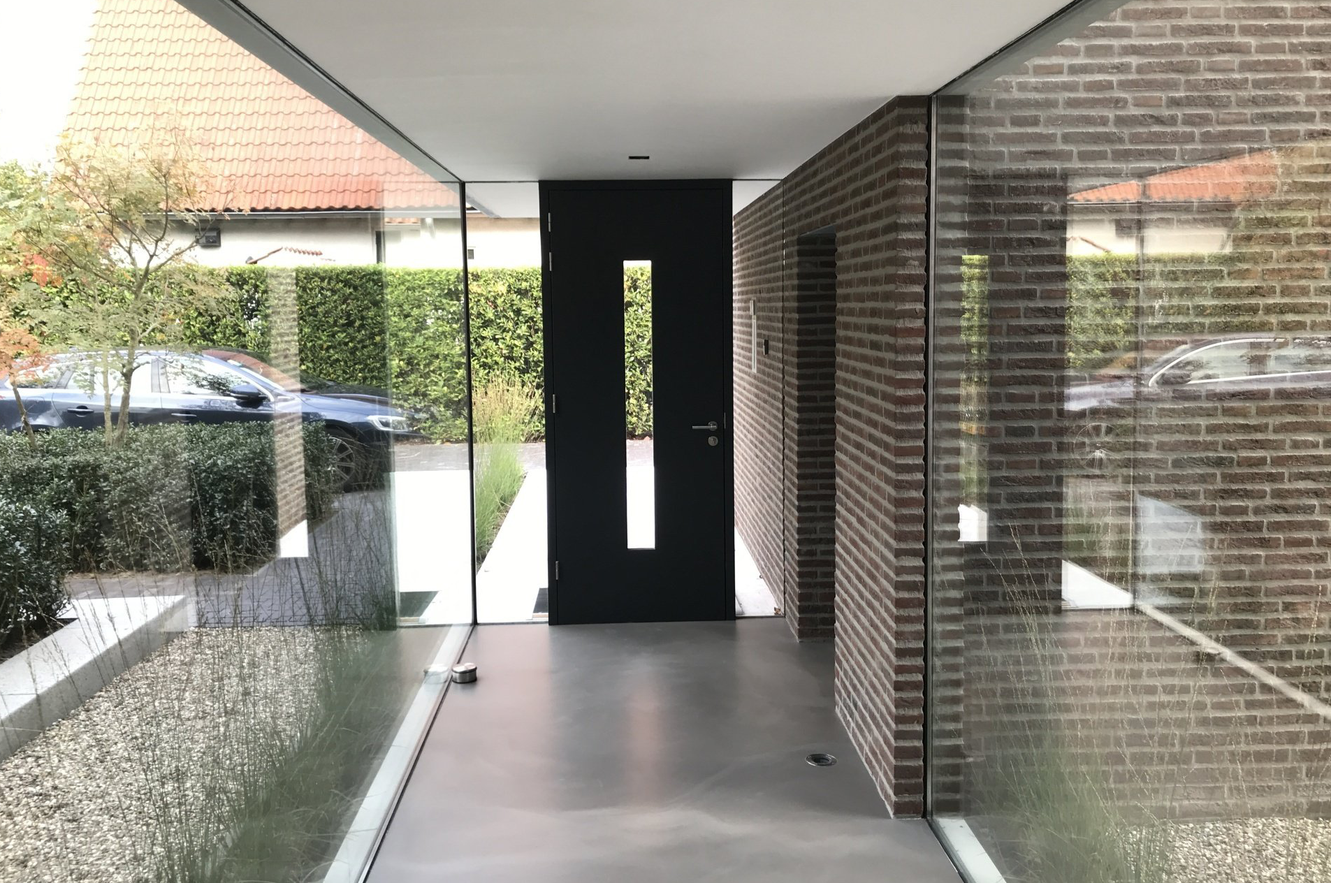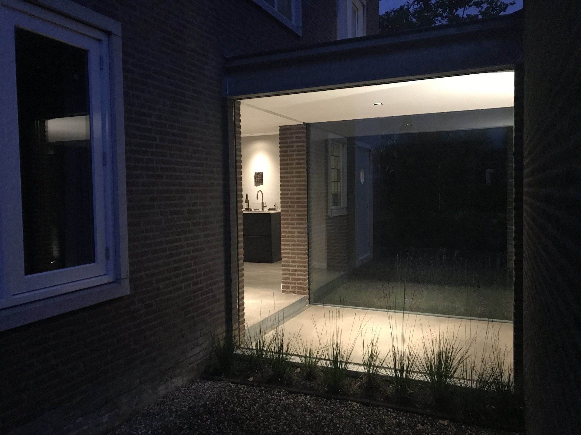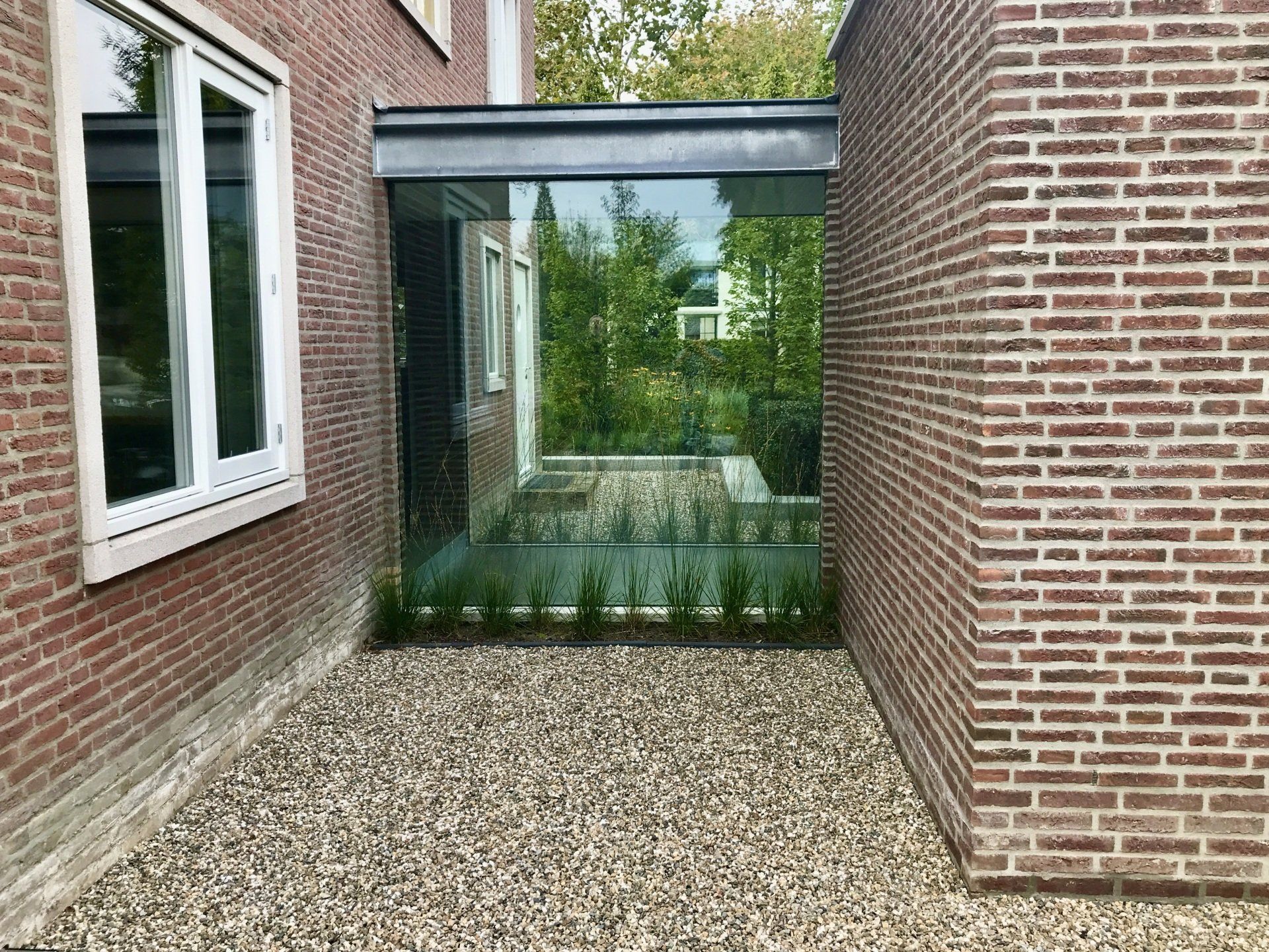 De geschakelde villa beschikte over een bescheiden keuken en dito badkamer. Door het wijzigen van de draagconstructie is op de begane grond ruimte gemaakt voor een royale keuken en op de verdieping voor twee badkamers en een toiletruimte. De bijkeuken, toiletruimte en garderobe zijn verplaatst naar het nieuwe bakstenen volume welke door de glazen hal en de nieuwe verzinkt stalen luifel is verbonden met de woning. Dit volume is - van de voorzijde gezien - vormgegeven als een muur die de scheiding vormt met de achtertuin. De transparante hal levert binnen en buiten interessante doorkijkjes en zichtlijnen.