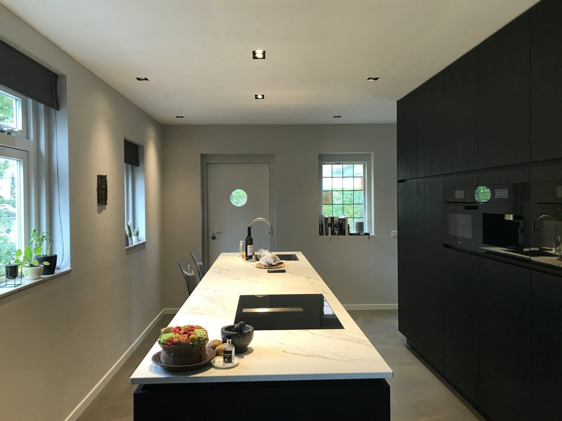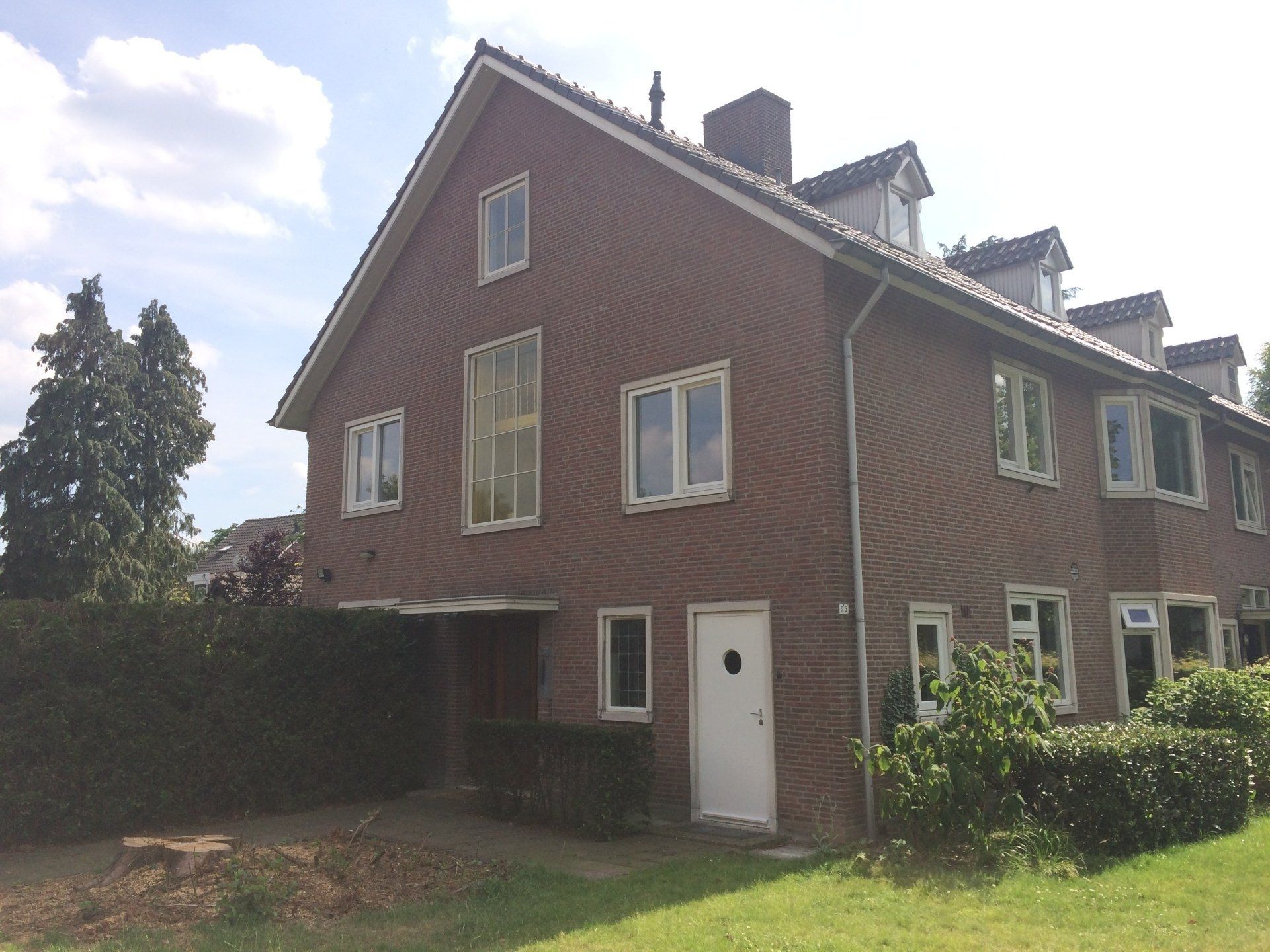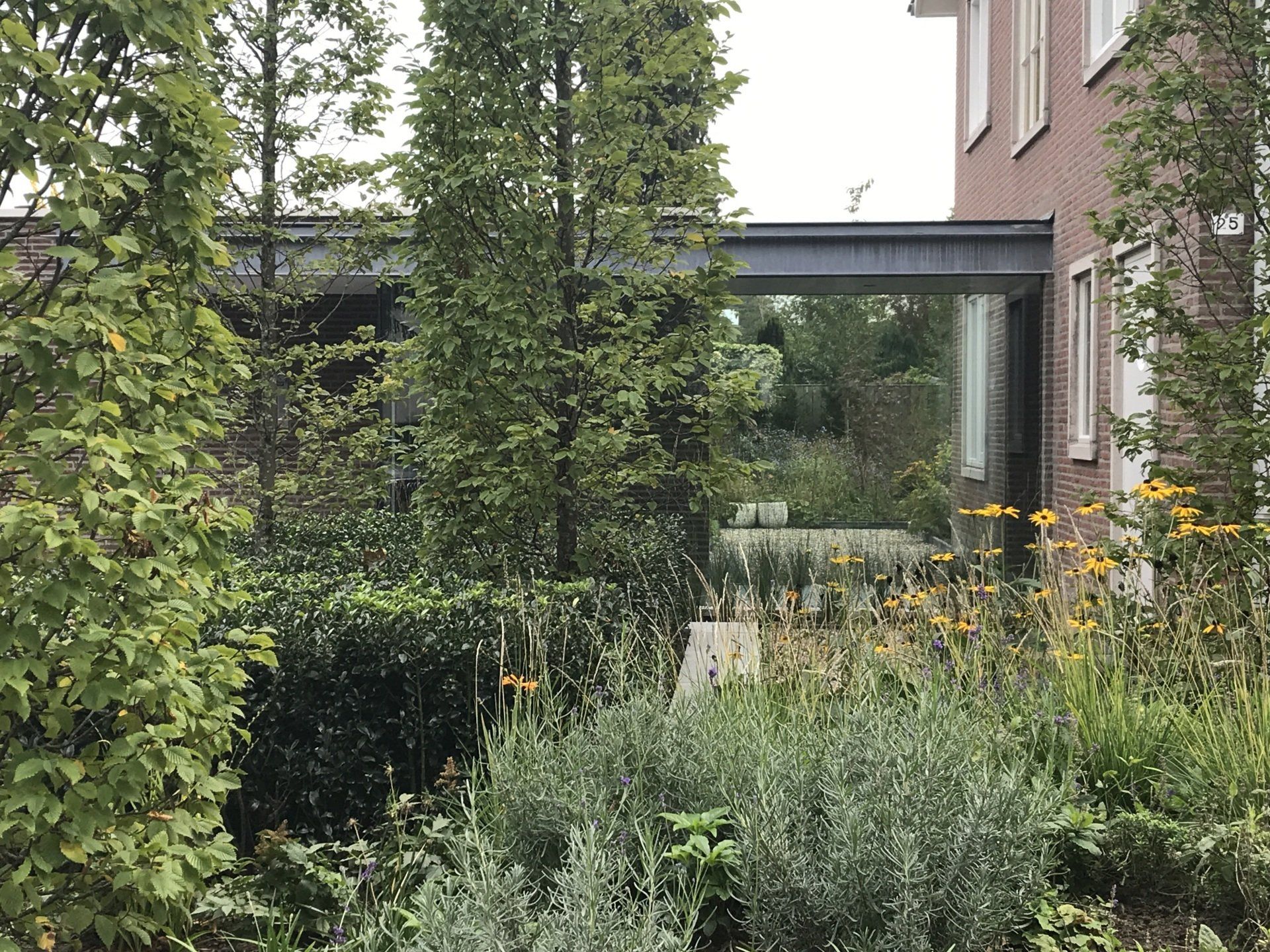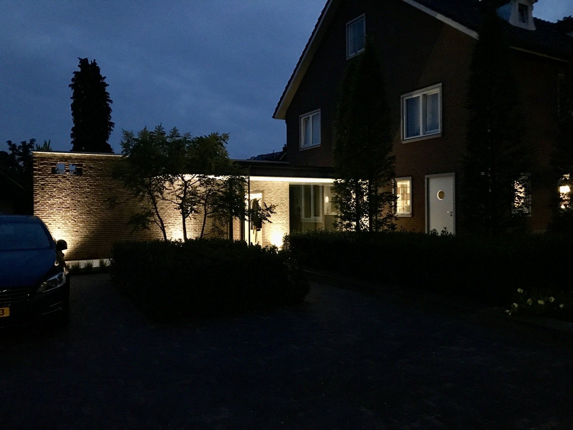 De geschakelde villa beschikte over een bescheiden keuken en dito badkamer. Door het wijzigen van de draagconstructie is op de begane grond ruimte gemaakt voor een royale keuken en op de verdieping voor twee badkamers en een toiletruimte. De bijkeuken, toiletruimte en garderobe zijn verplaatst naar het nieuwe bakstenen volume welke door de glazen hal en de nieuwe verzinkt stalen luifel is verbonden met de woning. Dit volume is - van de voorzijde gezien - vormgegeven als een muur die de scheiding vormt met de achtertuin. De transparante hal levert binnen en buiten interessante doorkijkjes en zichtlijnen.